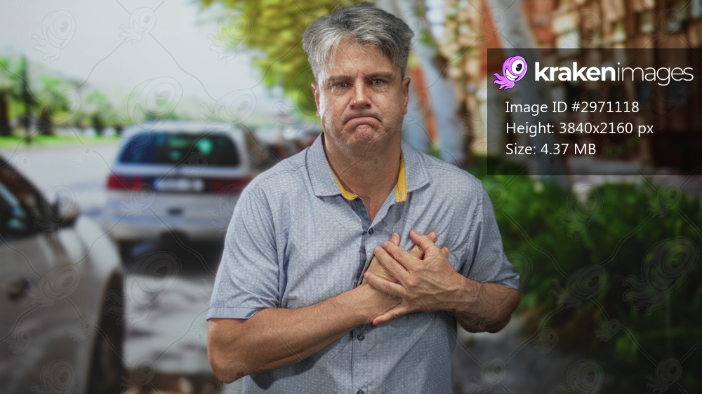 Man clutching chest with both hands indicating heartattack on a street lined with parked cars and trees; distress emergency help.