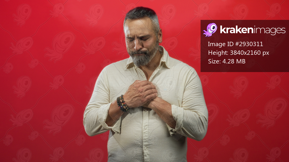 Man clutching chest with closed eyes, middle aged hispanic with grey beard and bracelets, wearing light shirt in red studio; remorse reflection.