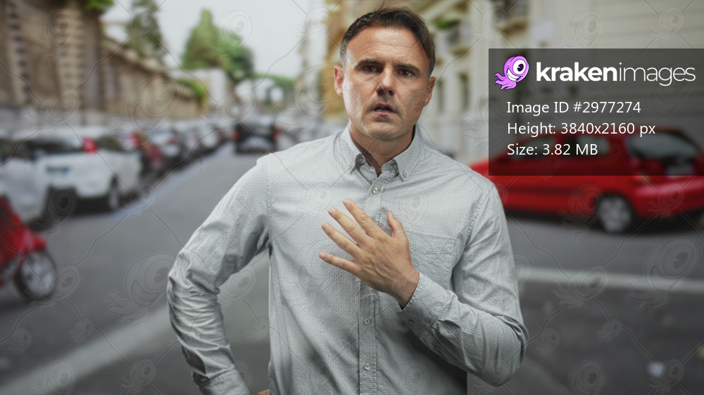 Man clutching chest for heartattack on street amid parked cars and buildings, wearing buttondown shirt; anxiety urgency.