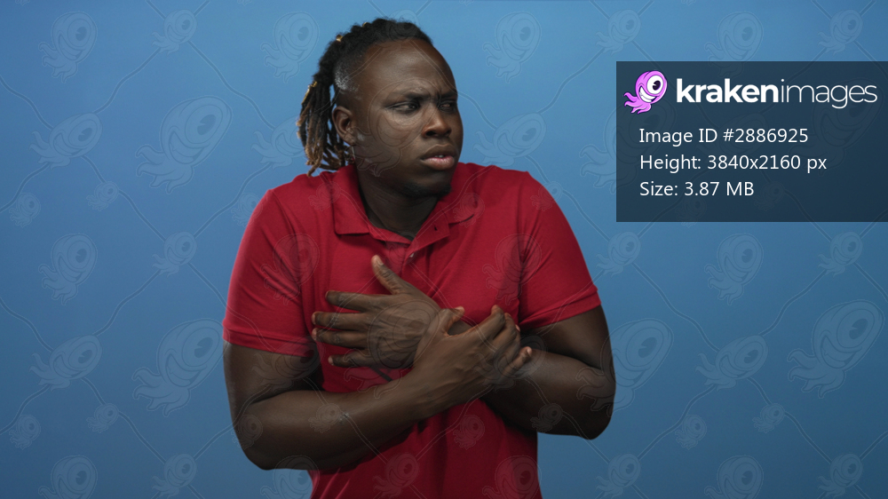 Man clutching chest with hands over heart in blue studio wearing red polo shirt, tense expression and braided hair visible, heartattack concern; panic emergency. - Kraken Images