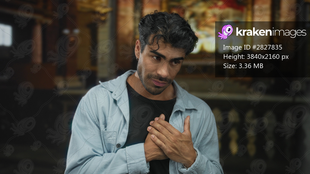 Man clutching chest in dimly lit church under stained glass window, face contorted by sudden ache; pain.