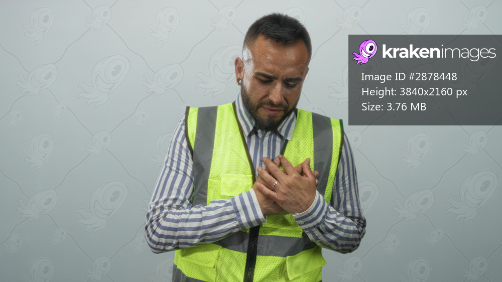 Man clutching chest in light blue studio wearing high visibility vest; distress health awareness safety.