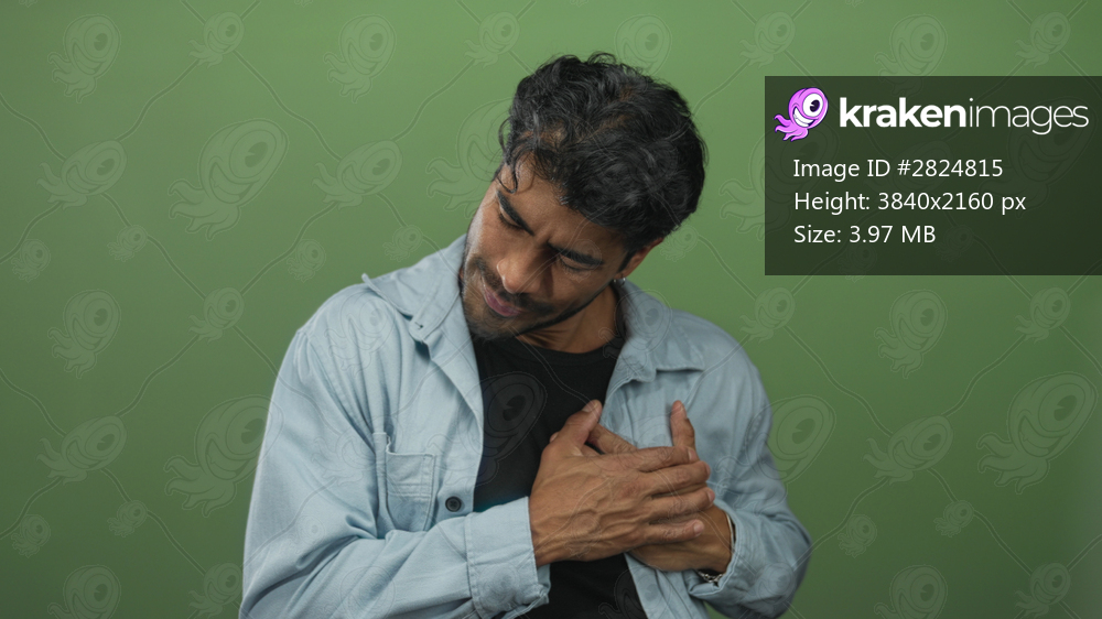 Man clutching chest in studio shot with serious worried expression against green background; pain distress.