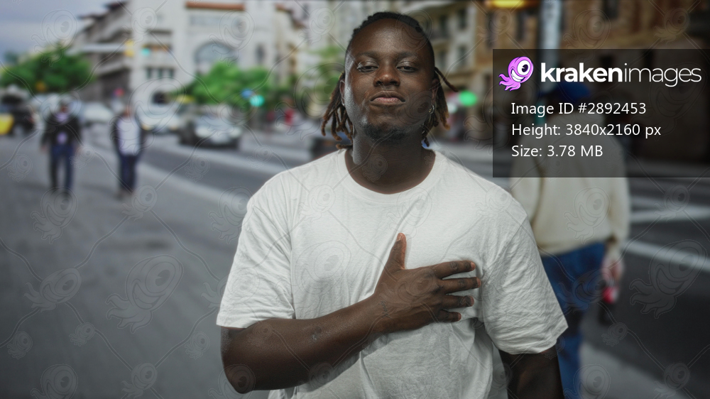 Man clutching chest on city street, hand pressed over heart in visible pain sign of heartattack; urgent help anxiety.