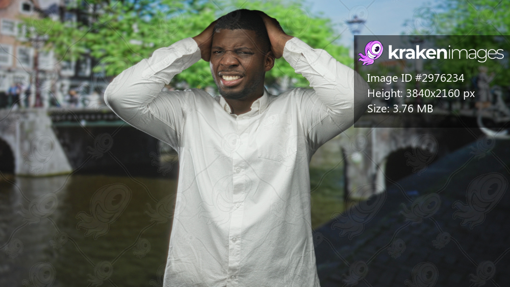 Man clutching head with hands, grimacing and squinting on street by canal bridge with stone arch and lampposts; stress urgency.