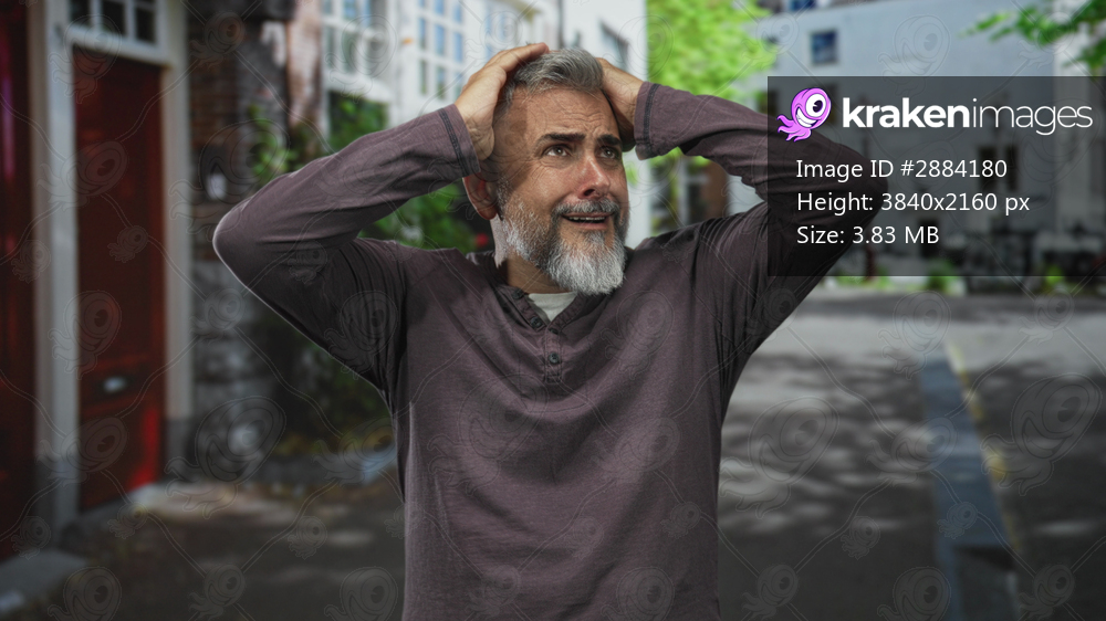 Man clutching his head with both hands on a cobbled city street, grey beard visible and eyes tearful, wearing long sleeve shirt; panic.
