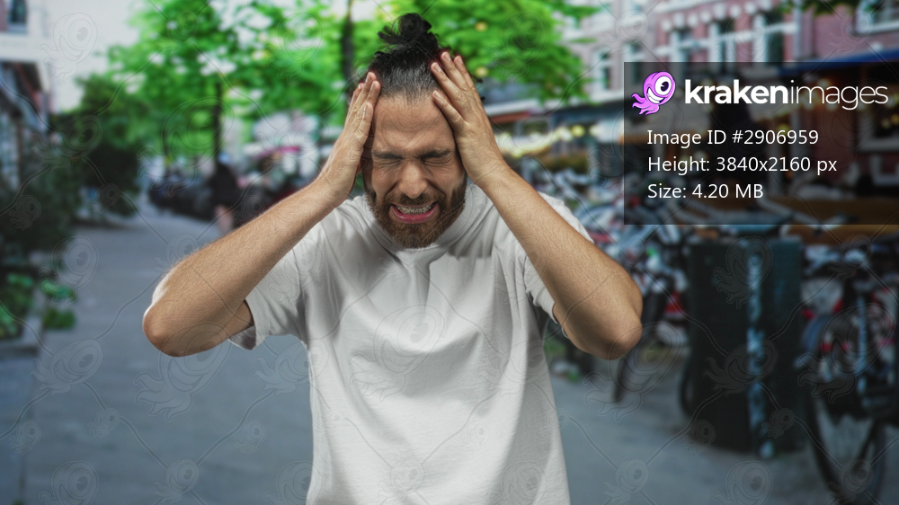 Man clutching his head with both hands on a crowded city street near parked bicycles, outdoor cafe tables and string lights; stress.