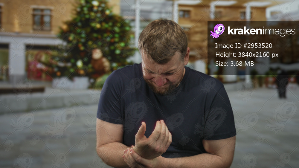 Man clutching his wrist and wincing while standing in front of a large decorated christmas tree on a busy city street; pain struggle.