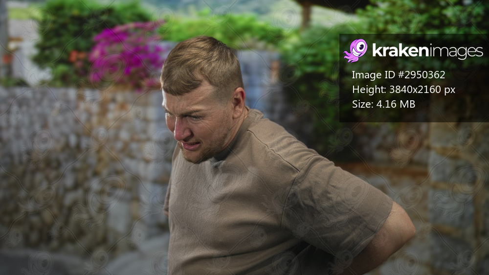 Man clutching lower back for backache on a stone street beside a rustic building, leaning with a pained face and hunched posture; discomfort determination. - Kraken Images