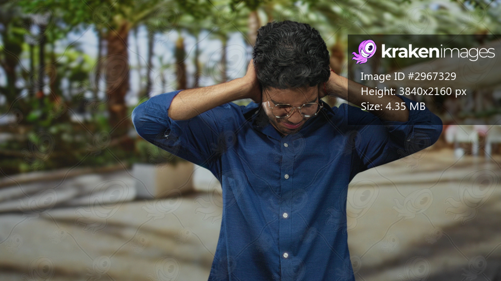 Man clutching neck and wincing, wearing glasses and blue shirt on a sunny street cafe walkway with palm trees and planters; pain tension.
