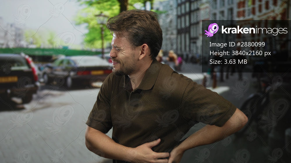 Man clutching right side and holding lower back on city street with backache near parked cars and bicycles; acute pain.