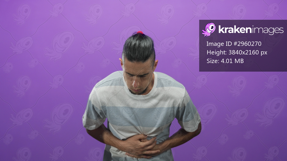 Man clutching stomach with both hands, hunched forward wearing a striped t shirt against a purple studio backdrop; pain.