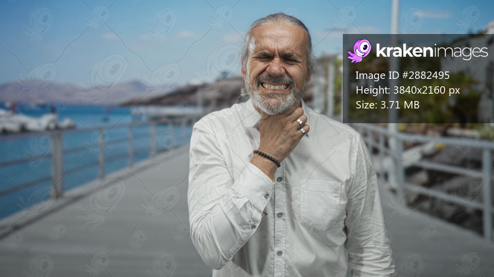 Man clutching throat for choking on seaside promenade, grimacing with closed eyes; pain vulnerability.