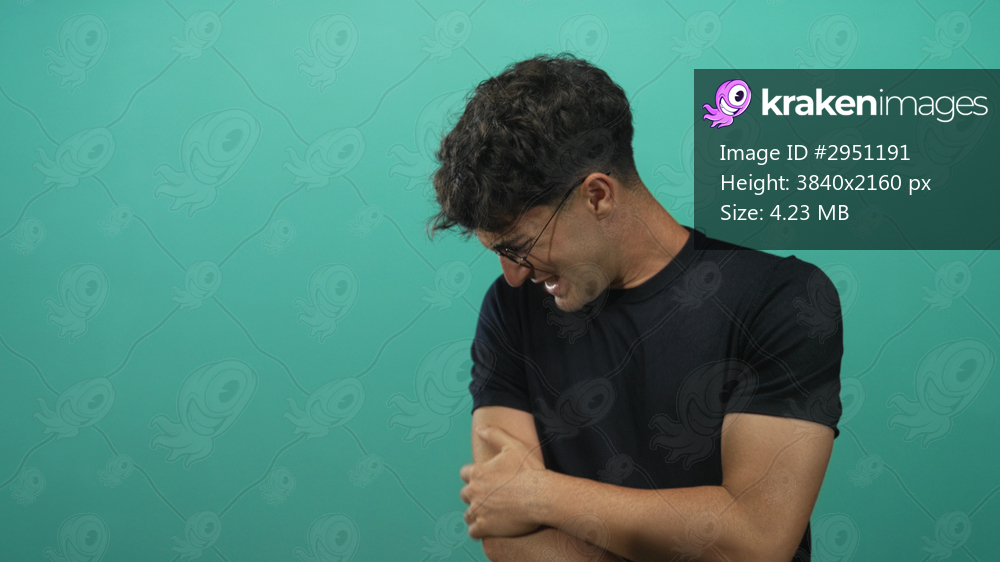 Man clutching upper arm and wincing in teal studio set, wearing glasses and black tshirt; pain vulnerability.