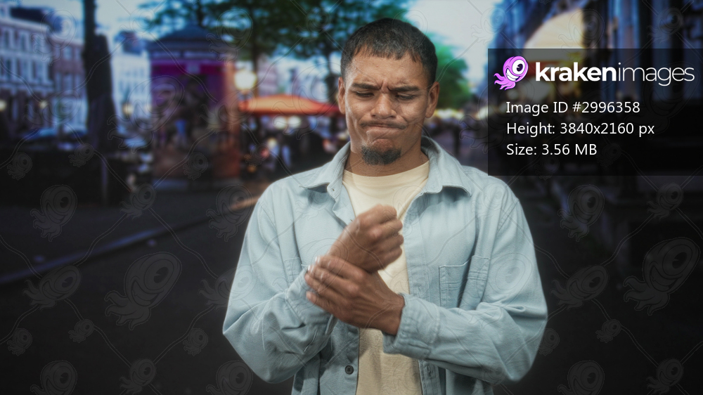 Man clutching wrist with a pained expression in a blue overshirt on a city street, holding his hands near his chest; discomfort.