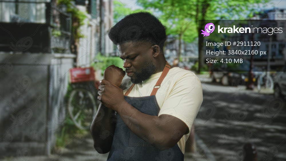 Man clutching wrist and grimacing on a sunlit city street while wearing a denim apron and cream tee, focused on wrist discomfort; pain.