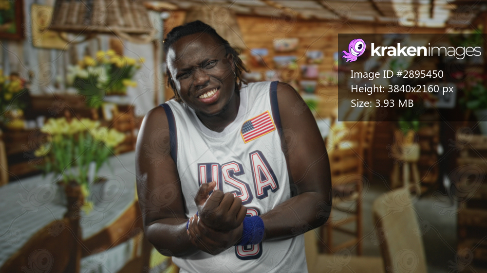 Man clutching wrist and gripping usa jersey in building setting with pained grimace and hunched shoulders; discomfort determination.