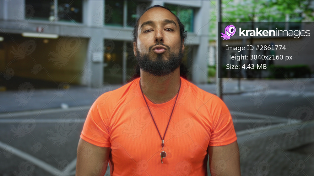 Man coach pointing index fingers upward on city street wearing orange tshirt and whistle lanyard, beard visible, hands raised; teamwork determination.
