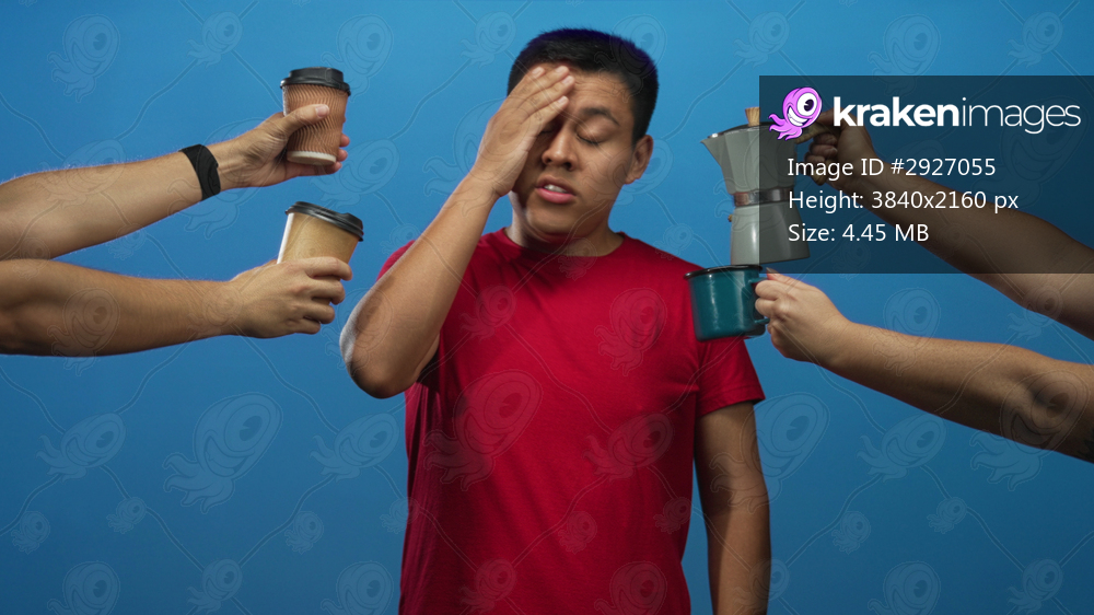 Man with coffee cups and a moka pot, hand to forehead in a studio against blue backdrop; fatigue morning routine.