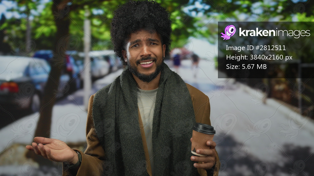 Man with coffee enjoying urban street outdoors with background of trees and parked cars, displaying casual emotion in a city setting.