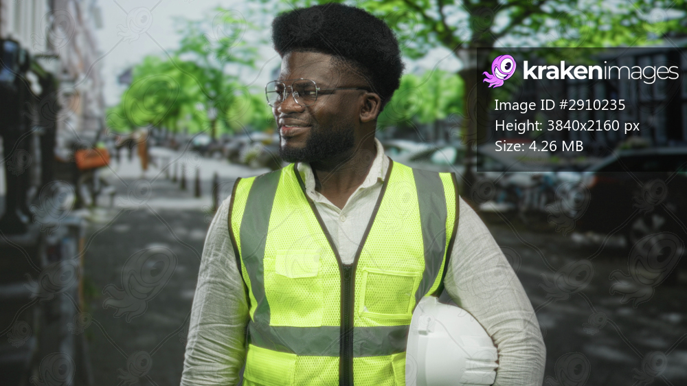 Man construction worker holding white hard hat and wearing fluorescent safety vest on street; confidence duty reliability.