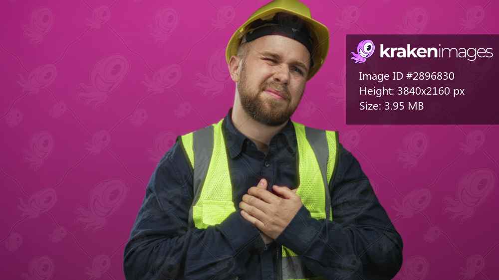 Man construction worker wearing yellow hardhat and hi vis vest clutching chest with hands in studio with magenta backdrop, grimace; pain.