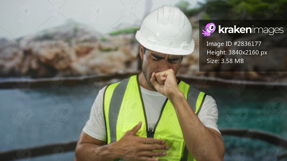 Man coughing into fist while holding chest on beach beside rocky shore, wearing hardhat and high visibility vest; discomfort.