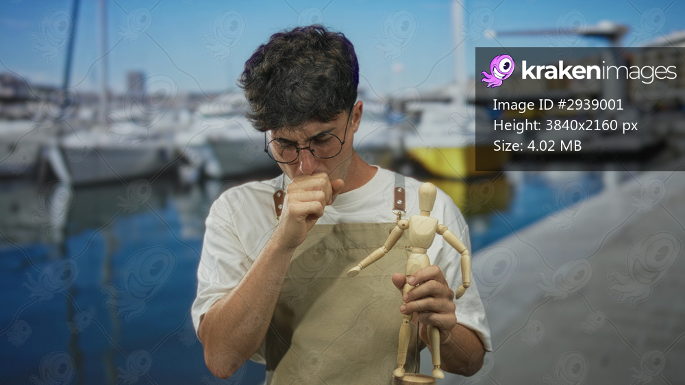 Man coughing into fist while holding wooden mannequin at port, wearing apron and round glasses; health concern.