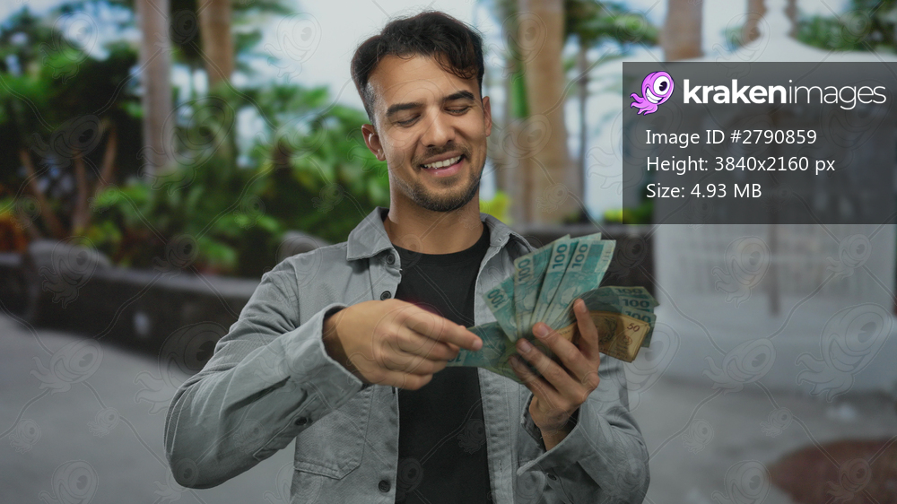Man counting brazilian money in an outdoor park setting with lush greenery and a peaceful atmosphere, showcasing financial success and leisure in a natural environment. - Kraken Images
