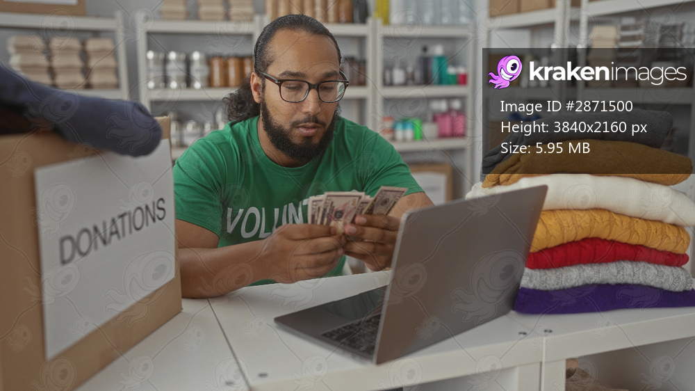 Man counting cash at donations table in community building wearing volunteer shirt and stacking folded sweaters; quiet compassion.