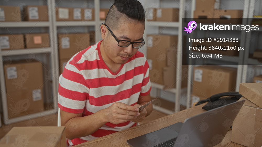 Man counting cash with hands among parcels and laptop on desk in an office building; entrepreneurial focus.