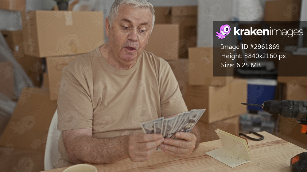 Man counting cash with hands holding dollar bills at table in building, surrounded by packed boxes and a drill nearby; financial concern.