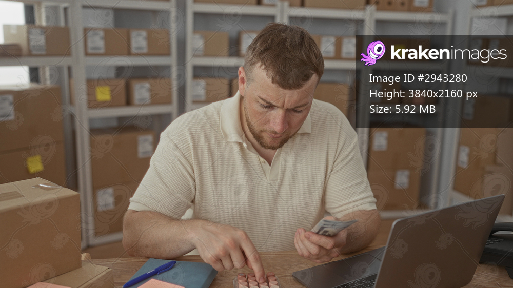 Man counting cash with hands over a desk of parcel boxes inside a storage building; financial worry.