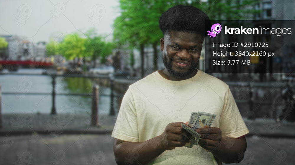 Man counting cash with hands while smiling on street by canal in amsterdam outdoors, holding us dollars in both hands; wealth success confidence.