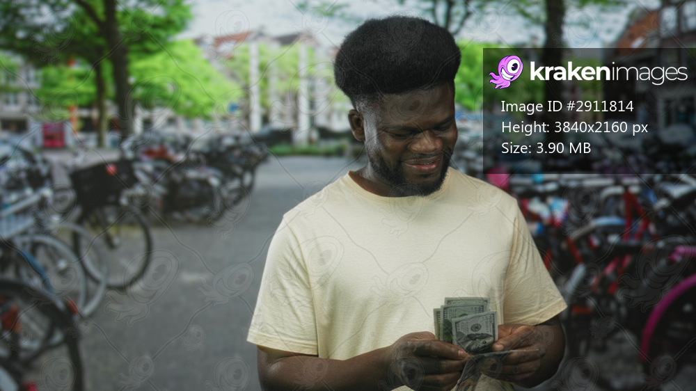 Man counting cash with hands while smiling on street with parked bicycles; satisfaction wealth success.