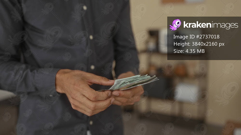 Man counting dollar bills in office, focusing on hands and currency, with office furniture in the background, highlighting financial activity and professional setting. - Kraken Images