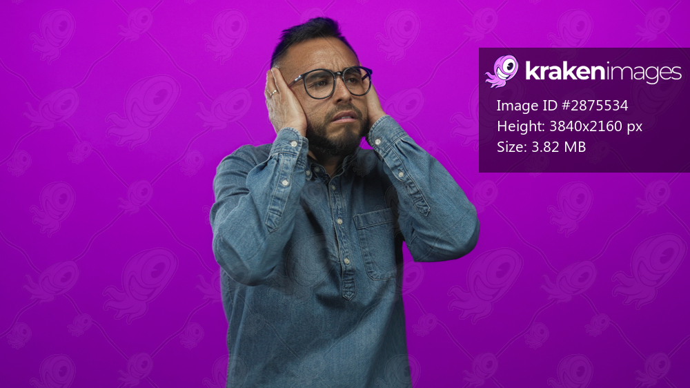 Man covering ears with hands in studio against bright magenta purple wall wearing denim shirt and glasses; discomfort.