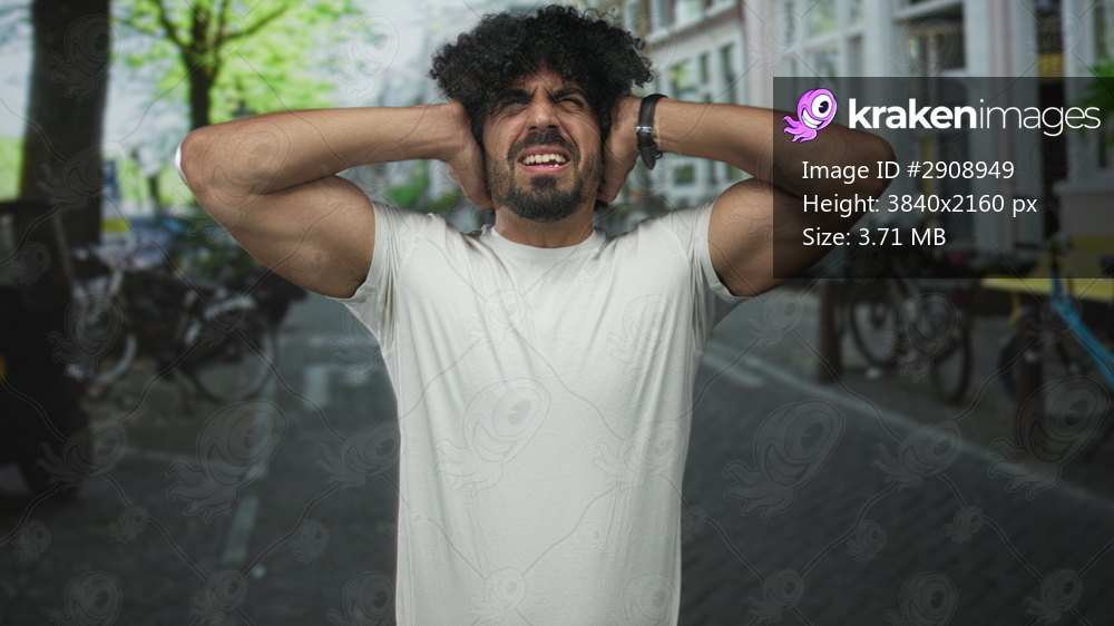 Man covering ears with hands on a city street, grimacing with muscular arms visible against loud traffic noise; urban noise stress.