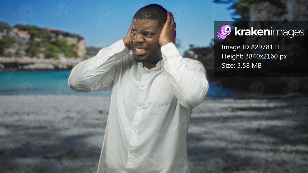Man covering ears, hands pressed to head in white shirt on a studio beach set with a grimacing face; frustration.