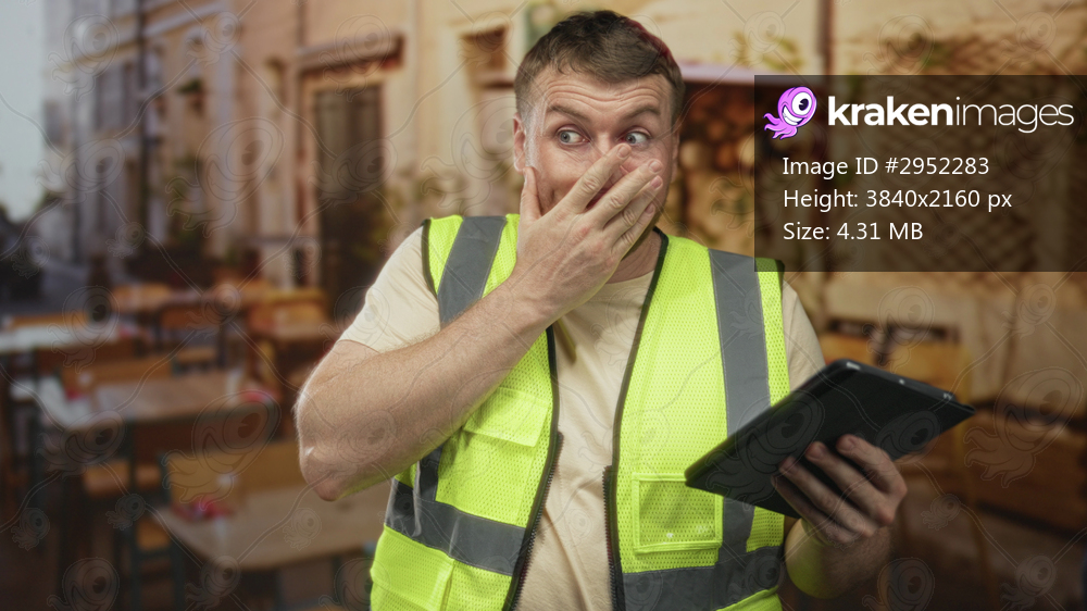 Man covering eye with hand while holding tablet in a building near a restaurant terrace; work stress concern.