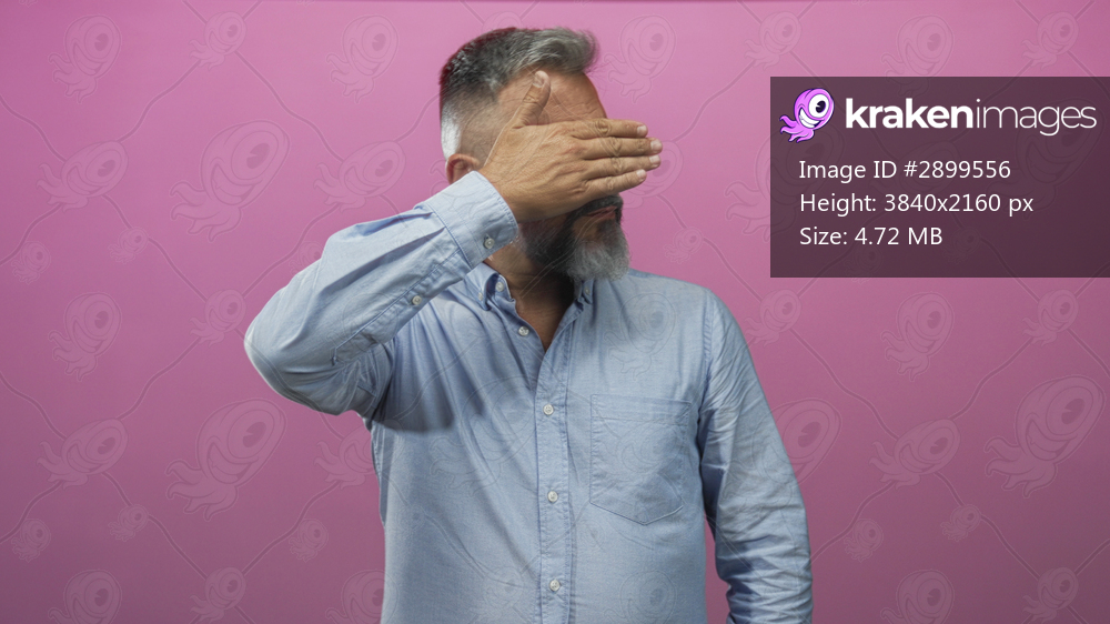 Man covering eyes with hand while standing in pink studio wearing light blue shirt, hand across face and visible beard; introspection solitude.