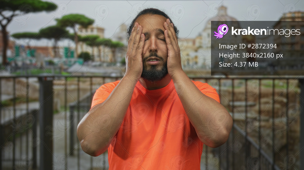 Man covering eyes with hands at roman ruins by a stone building, orange shirt and bare hands prominent; stress solitude.