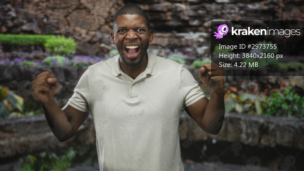 Man covering eyes with hands and clenching fists while smiling and closing eyes in a studio set framed by rock wall and plants; joy surprise.