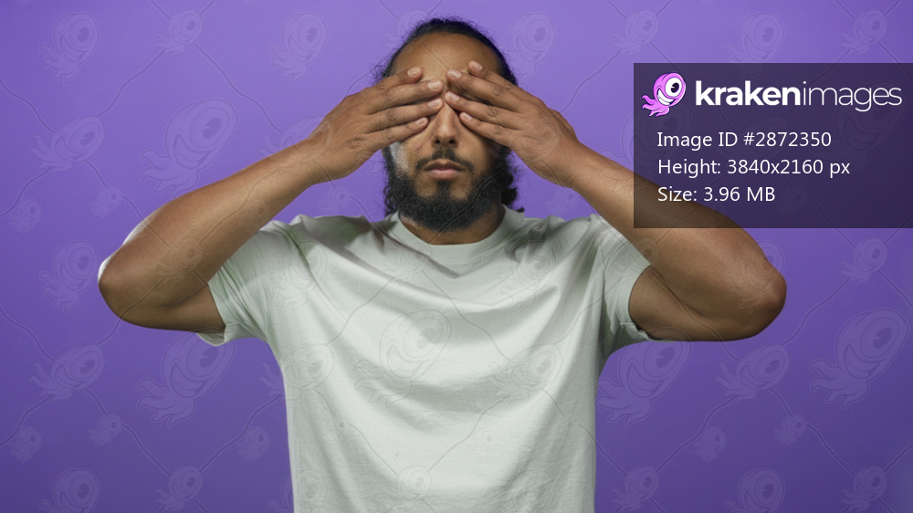Man covering eyes with hands and visible beard wearing white t shirt in studio; surprise celebration excitement.