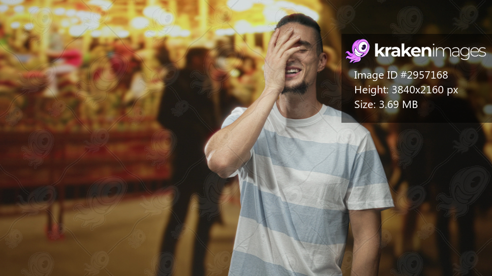 Man covering face with hand, facepalm gesture at a carnival carousel amid a crowded night fair; embarrassment reflection.