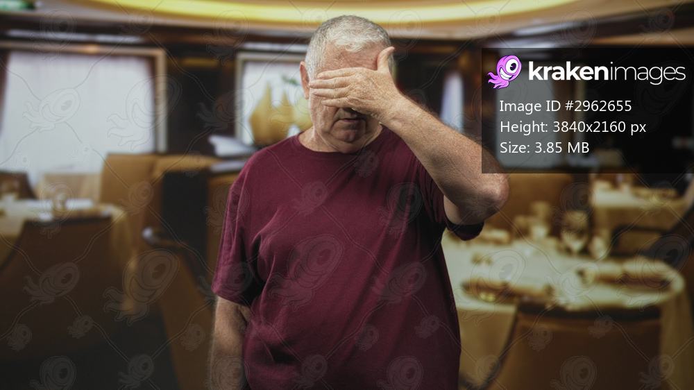 Man covering face with hand, hands over eyes and forehead in a restaurant dining room building; fatigue frustration.