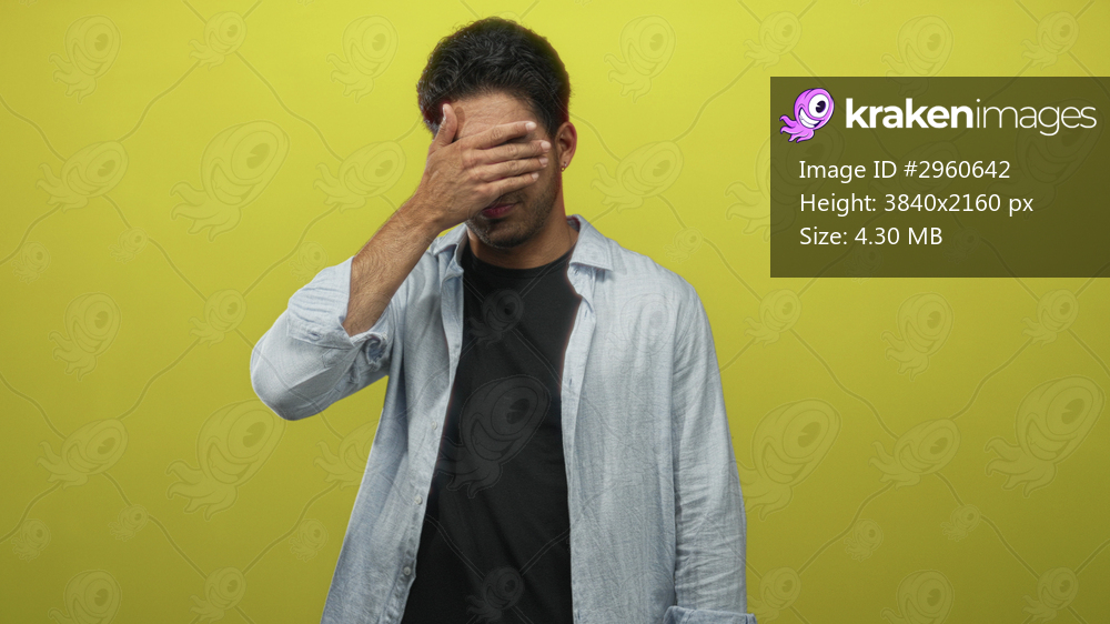 Man covering face with hand in studio against bright yellow backdrop, wearing light shirt over black tshirt, standing and looking down; embarrassment.