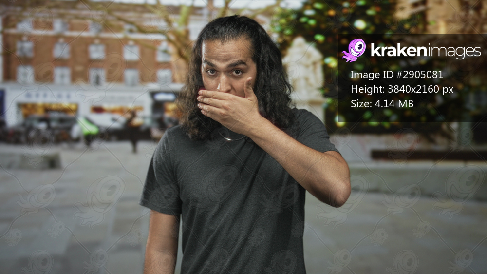 Man covering face with hand on a street plaza in front of a decorated christmas tree and statue; shame privacy.