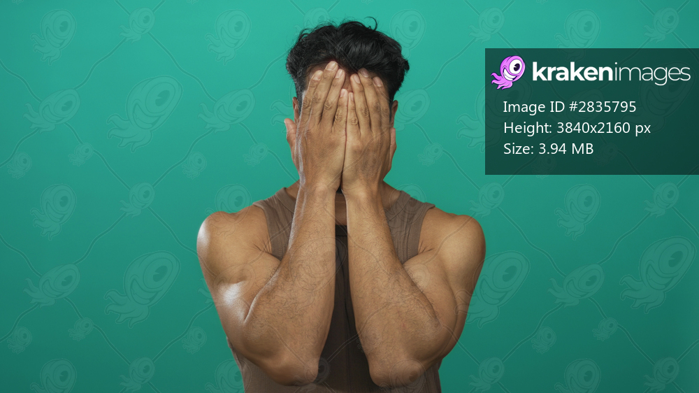 Man covering face with hands in studio with vibrant green background while making playful expressions; joy.