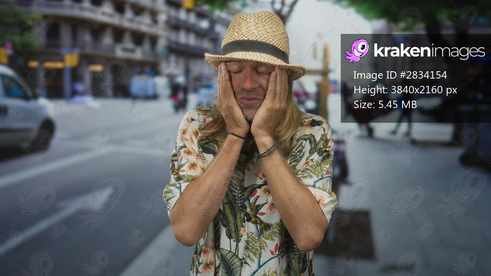 Man covering face with hands wearing floral shirt amid sunny busy urban street traffic; embarrassment.